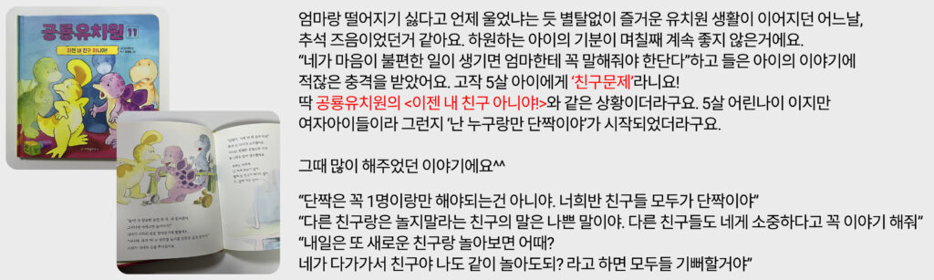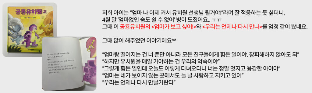 유치원 입학 후 힘든 하루하루를 보내고 있는 아이의 부모님이라면 정말 추천드려요.